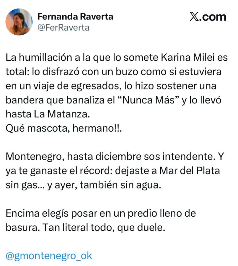 Además, criticó la gestión de Montenegro y afirmó que "se ganó un récord" por haber dejado "sin gas y sin agua" a la gente de Mar del Plata. "Encima elegís posar en un predio lleno de basura. Tan literal todo, que duele", sentenció.