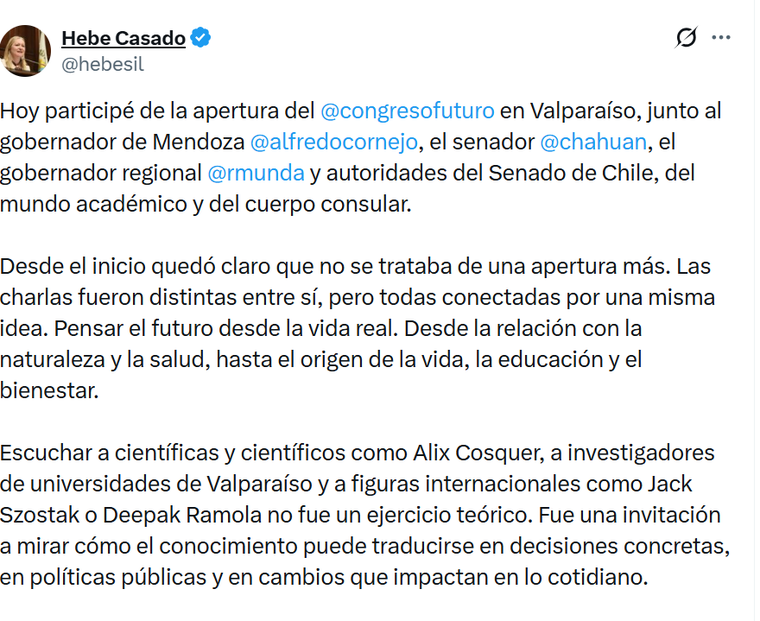 A través de la red social X, la vicegobernadora subrayó: "Desde el inicio quedó claro que no se trataba de una apertura más. Las charlas fueron distintas entre sí, pero todas conectadas por una misma idea. Pensar el futuro desde la vida real. Desde la relación con la naturaleza y la salud, hasta el origen de la vida, la educación y el bienestar. Escuchar a científicas y científicos como Alix Cosquer, a investigadores de universidades de Valparaíso y a figuras internacionales como Jack Szostak o Deepak Ramola no fue un ejercicio teórico. Fue una invitación a mirar cómo el conocimiento puede traducirse en decisiones concretas, en políticas públicas y en cambios que impactan en lo cotidiano".