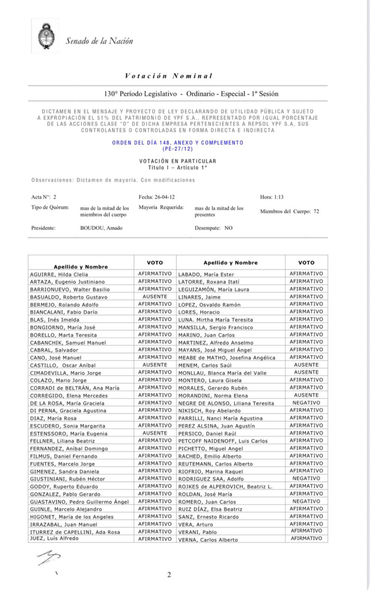 Qué legisladores apoyaron la estatización de YPF