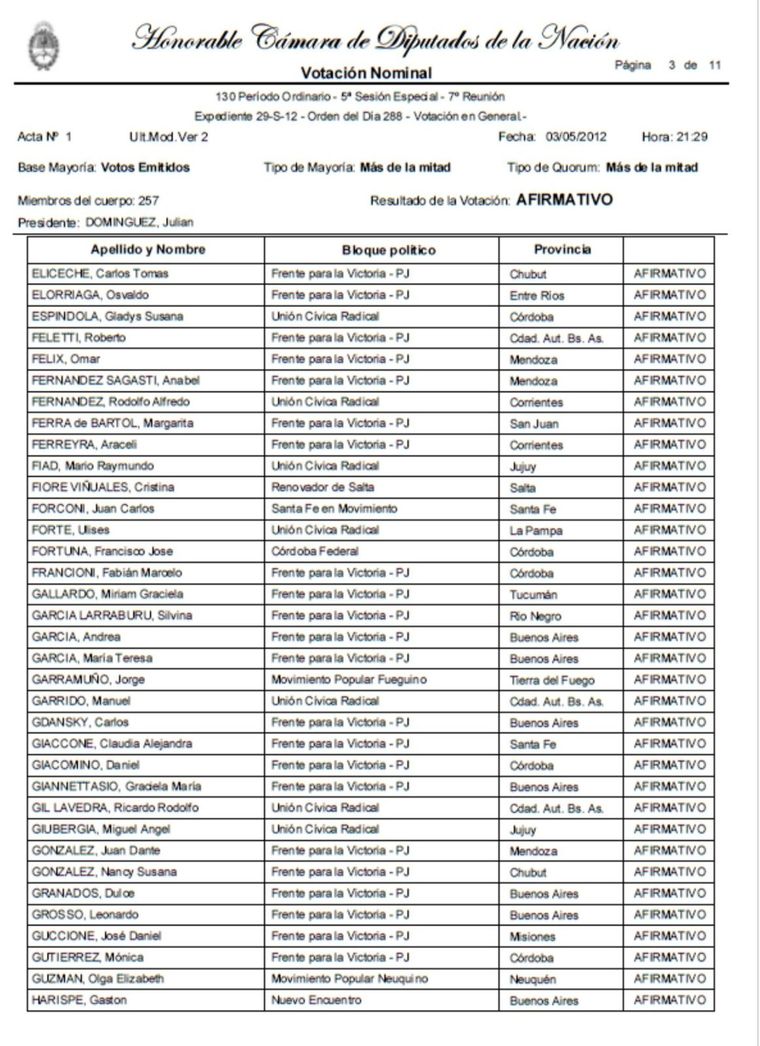 Luego, el proyecto fue remitido inmediatamente a la Cámara de Diputados, que concluyó con la aprobación de la expropiación de YPF el 3 de mayo de 2012. La iniciativa obtuvo amplia mayoría, con 208 votos a favor, 32 en contra y 5 abstenciones.