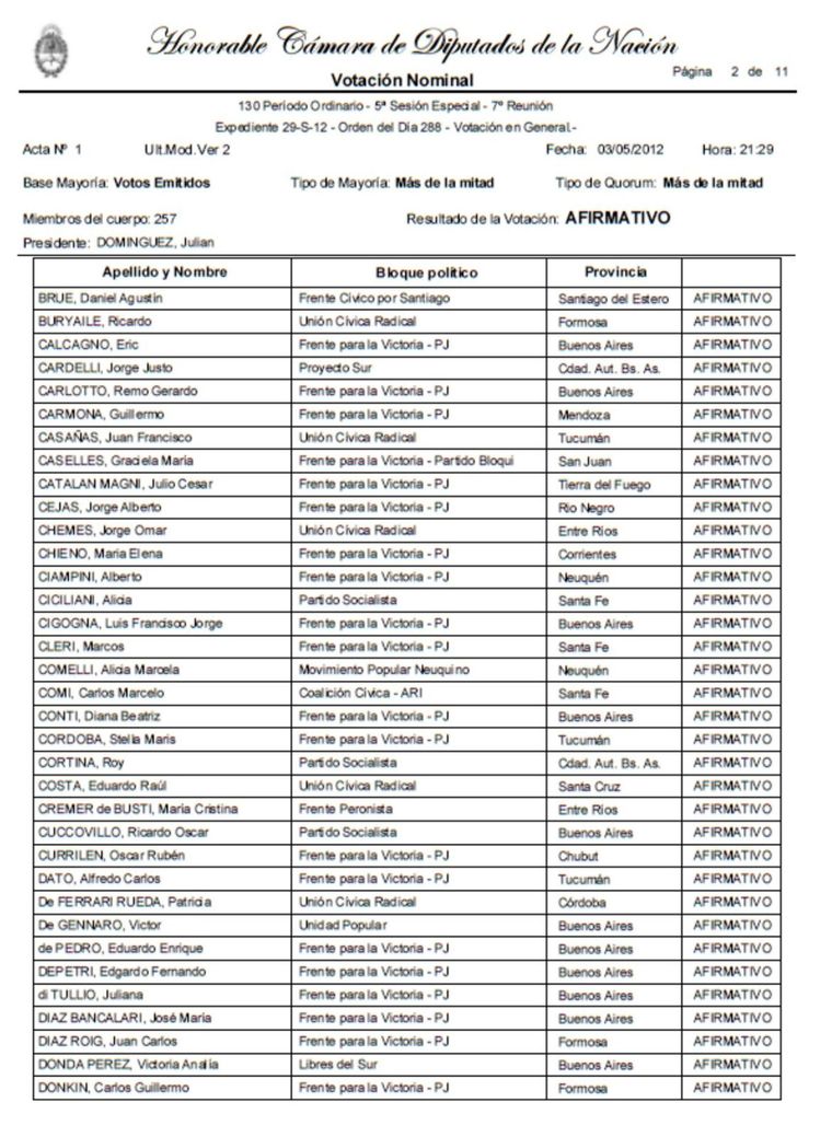 El proyecto del Ejecutivo tuvo un masivo respaldo opositor en general, pero no en particular. El kirchnerismo contó con el acompañamiento del FAP, Proyecto Sur y el grueso del radicalismo, además de sus bancadas aliadas: Nuevo Encuentro, Frente Cívico por Santiago, el PJ de La Pampa y Unión Peronista.