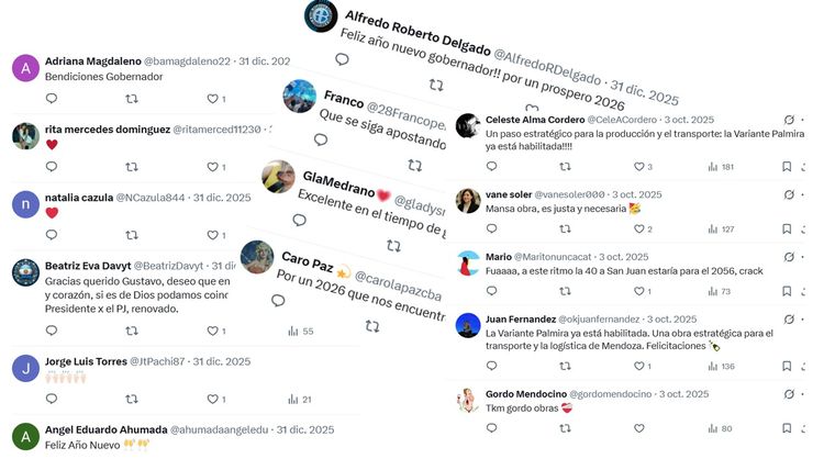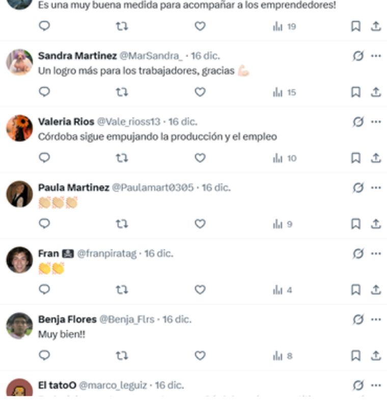 Un ejemplo: la siguiente captura de pantalla muestra parte de los comentarios de un posteo al azar de la cuenta personal de Llaryora, en X, en donde se pueden encontrar 36 mensajes de apoyo al gobernador.