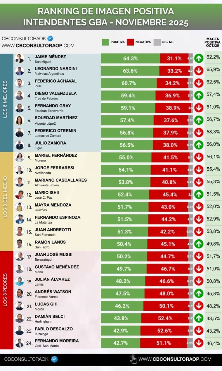La última medición de CB Consultora, correspondiente a noviembre de 2025, volvió a poner bajo la lupa el desempeño de los jefes comunales del Gran Buenos Aires, revelando un ránking de imagen positiva que muestra cambios relevantes en algunos distritos clave.