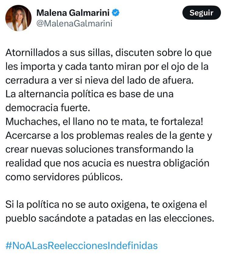 Galmarini hizo su descargo compartiendo las palabras de la legisladora del FR Sofia Vannelli, quien se opuso con su voto a la iniciativa del kicillofismo, aún siendo del mismo bloque. “La alternancia en los cargos permite que aparezcan nuevas voces, evita que el poder se eternice en las bancas y renueva la política, fortaleciendo así la democracia. Seguimos defendiendo una política con límites, con reglas claras y de cara a la gente”, sostuvo la senadora en X.