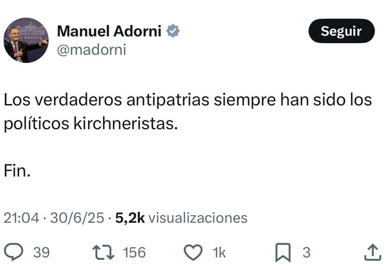 “El nivel de ostracismo es astronómico. Fin”, fue el primer comentario de Adorni sobre la publicación de Axel Kicillof. Minutos más tarde, retomó las acusaciones del mandatario provincial y remató: “Los verdaderos antipatrias siempre han sido los políticos kirchneristas”.