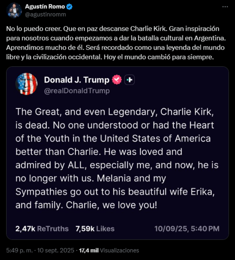 Tras la muerte del influencer trumpista Charlie Kirk, distintos referentes del esquema digital de La Libertad Avanza se manifestaron en las redes.