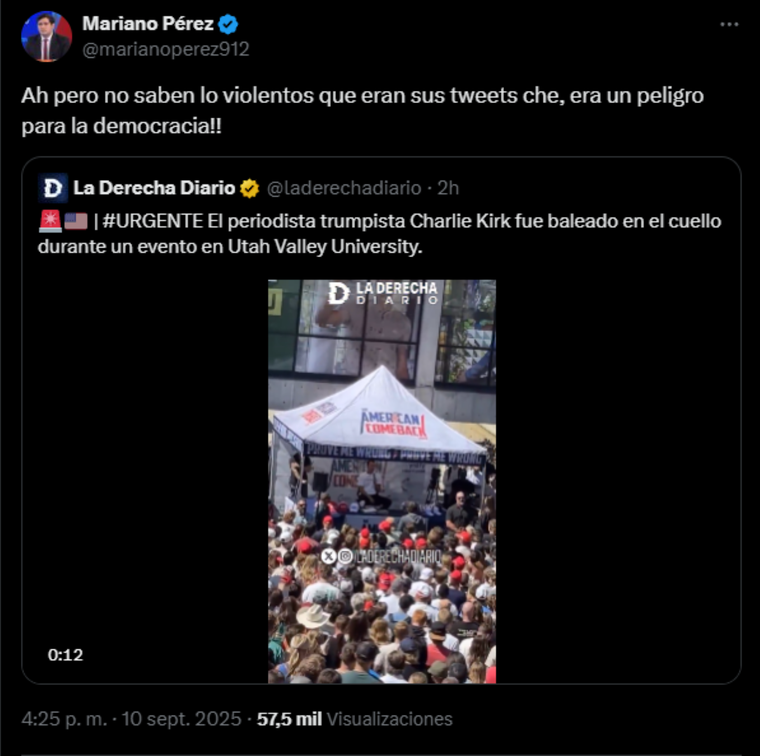 Captura de pantallaEste miércoles se conoció el asesinato del activista conservador vinculado al movimiento trumpista Charlie Kirk, durante un evento encabezado en la Utah Valley University luego de recibir un disparo ante dos mil personas. El hecho generó repercusiones en el mundo de La Libertad Avanza.