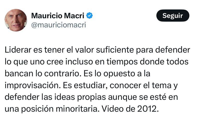 “Liderar es tener el valor suficiente para defender lo que uno cree incluso en tiempos donde todos bancan lo contrario. Es lo opuesto a la improvisación. Es estudiar, conocer el tema y defender las ideas propias aunque se esté en una posición minoritaria”, publicó el líder del PRO.