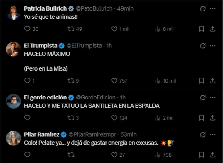 Desde el espacio libertario, la cuenta atribuida a Santiago Caputo, escribió: “Pelate, loko.” En contraste, la ministra de Seguridad Patricia Bullrich, excompañera de Santilli en Juntos por el Cambio, lo alentó con complicidad: “Yo sé que te animas!!”.