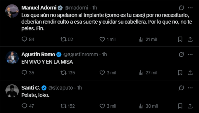 El vocero presidencial, Manuel Adorni, fue uno de los primeros en responderle: “Los que aún no apelaron al implante (como es tu caso) por no necesitarlo, deberían rendir culto a esa suerte y cuidar su cabellera. Por lo que no, no te peles. Fin.”