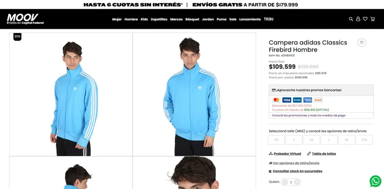 Se trata del modelo “Adidas Firebird Classics”, confeccionado en poliéster reciclado y con el logo bordado de la línea Originals. En tiendas oficiales, la campera figura con descuentos que van desde el 10% al 20%. Así, los precios finales varían entre $109.599 y $121.999.