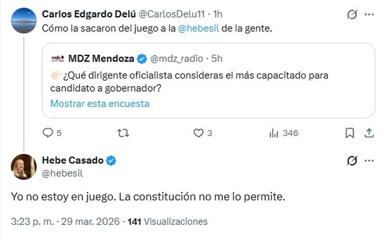 La vicegobernadora Hebe Casado, quien suele expresarse con habitualidad en sus redes sociales, cruzó este domingo a un usuario "X" que había lanzado un comentario irónico en respuesta a una encuesta de MDZ.