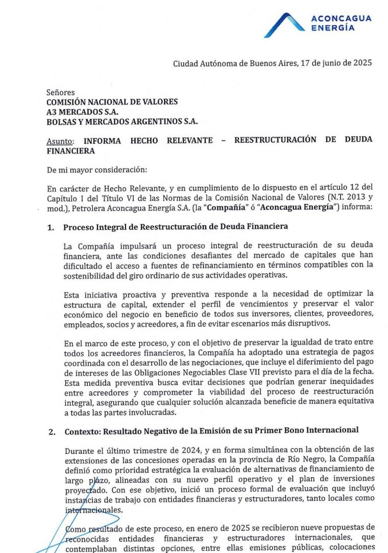 La crisis de las empresas quedó en evidencia cuando el grupo Albanesi anunció en mayo que no podía hacer frente a sus obligaciones. Esa empresa, que tiene más del 5% de la generación del país, no pudo pagar los intereses de la deuda. En el caso de Aconcagua, ejecutará en simultáneo un plan de reestructuración de sus pasivos. Según informaron, se prioriza la operación y los compromisos que aseguran la producción. La Compañía impulsará un proceso integral de reestructuración de su deuda financiera...Esta iniciativa proactiva y preventiva responde a la necesidad de optimizar la estructura de capital, extender el perfil de vencimientos y preservar el valor económico del negocio", informaron.