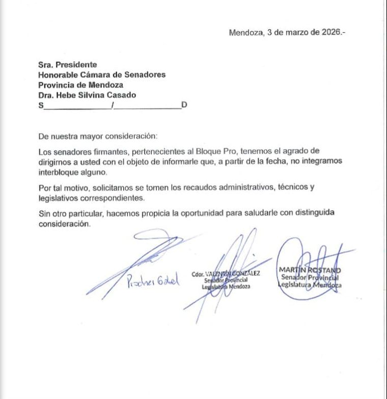 La nota tiene fecha del martes 3 de marzo, es decir el día de la última sesión del Senado. Está dirigida a Hebe Casado y en ella informan que: "los abajos firmantes, pertenencientes al bloque PRO, tenemos el agrado de dirigirnos a usted con el objeto de informarle que, a partir de la fecha, no integramos interbloque alguno", dice en el primer párrafo.