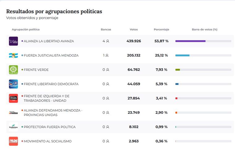 El frente La Libertad Avanza+Cambia Mendoza sacó una amplia diferencia, ya que duplicó al PJ mendocino en las elecciones legislativas. El resultado fue del 53,72% a 25,43%. Esa diferencia es mayor a lo esperado y generará una ampliación de la base de poder de Cornejo en Mendoza y de Milei.