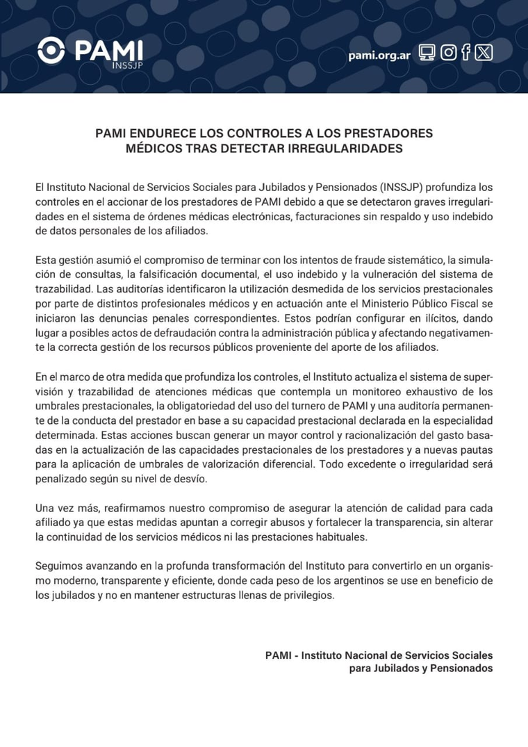 "EI Instituto Nacional de Servicios Sociales para Jubilados y Pensionados (INSSJP) profundiza los controles en el accionar de los prestadores de PAMI debido a que se detectaron graves irregularidades en el sistema de órdenes médicas electrónicas, facturaciones sin respaldo y use indebido de datos personales de los afiliados", expresaron.