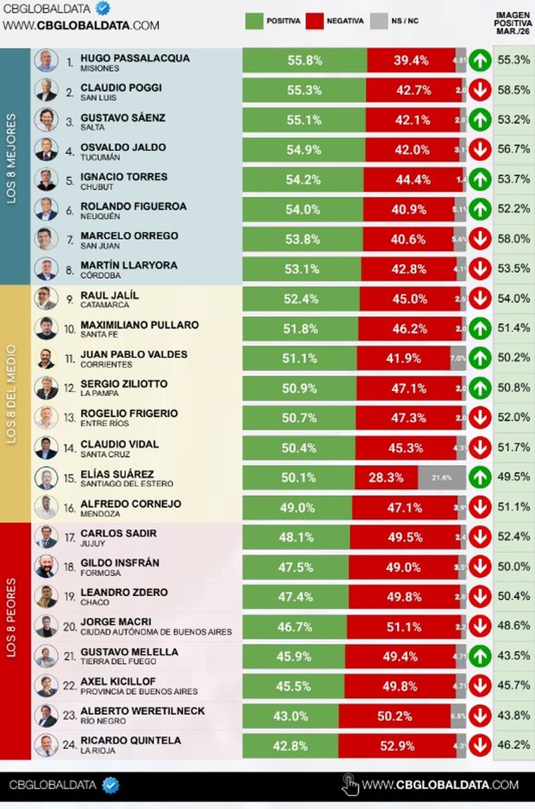 La consultora CB hace el relevamiento en forma mensual en las 24 provincias para medir la valoración pública de los mandatarios provinciales. El gobernador de Tucumán Osvaldo Jaldo se posicionó en el cuarto lugar con el 54,0%. En el quinto se situó el mandatario de Chubut con el 54,2%.