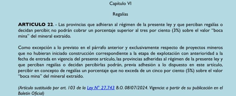 Este artículo agrega particularmente que, como excepción al tope del 3% de regalías, "y exclusivamente respecto de proyectos mineros que no hubieran iniciado construcción correspondiente a la etapa de explotación con anterioridad a la fecha de entrada en vigencia del presente artículo, las provincias adheridas al régimen de la presente ley y que perciban regalías o decidan percibirlas podrán, previa adhesión a lo dispuesto en este artículo, percibir en concepto de regalías un porcentaje que no exceda de un cinco por ciento (5%) sobre el valor “boca mina” del mineral extraído".