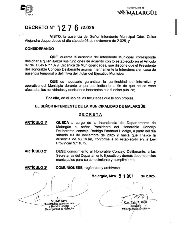 El decreto 1276/2025 comunica la ausencia de Jaque desde el sábado 3 de noviembre - que no existió ese día como tal ya el lunes fue 3- y nombra como reemplazante al presidente del Concejo, Rodrigo Emanuel Hidalgo, hasta que finalice la ausencia de su titular. Tiene la fecha del 31 de octubre el documento legal pero no hay más detalles.
