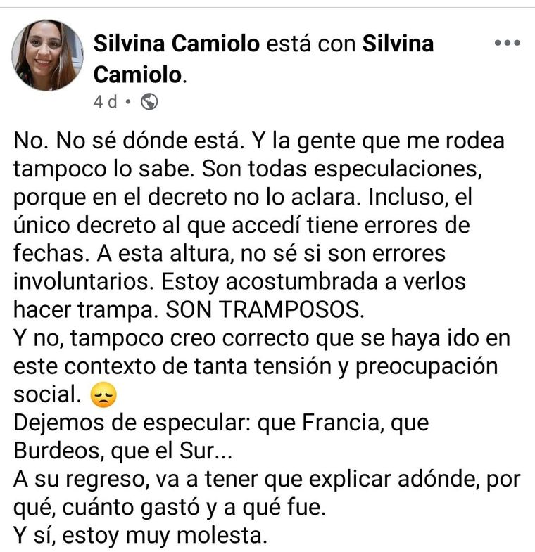 En el Concejo Deliberante se trató el tema. La concejal Silvina Camiolo (Reconstruyendo Malargüe, quien fue reelecta en su banca), posteó en Facebook: "No. No sé dónde está. Y la gente que me rodea tampoco lo sabe. Son todas especulaciones, porque en el decreto no lo aclara. Incluso, el único decreto al que accedí tiene errores de fechas. A esta altura, no sé si son errores involuntarios. Estoy acostumbrada a verlos hacer trampa. son tramposos. Y no, tampoco creo correcto que se haya ido en este contexto de tanta tensión y preocupación social", aseveró.