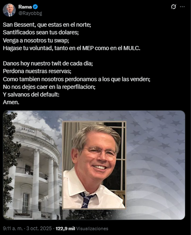 Comienza con “San Bessent, que estas en el norte; Santificados sean tus dólares” y hace guiños al MEP, al MULC y a los temores de reperfilación y default.