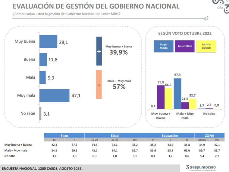 Además, este malestar se traduce en la evaluación de la gestión nacional. Hoy predomina una visión negativa (57%) frente a una positiva de apenas 39,9%, lo que implica un deterioro de 8,1 puntos en la mirada favorable con respecto a julio. La pérdida de apoyo muestra que el desgaste del oficialismo es rápido y se profundiza en paralelo a las denuncias de irregularidades.