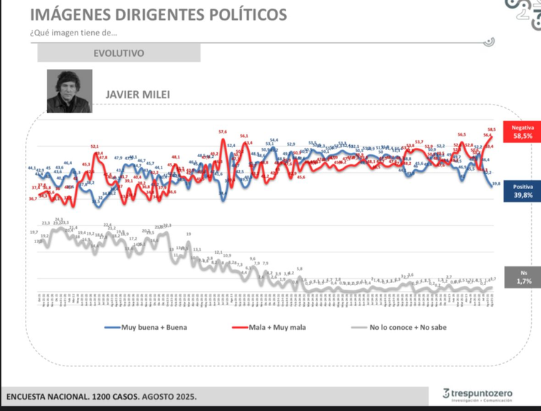 En este escenario, la imagen de Javier Milei sufrió un fuerte retroceso. Su nivel de rechazo creció 12 puntos, alcanzando un porcentaje del 58.5% en el último mes, un salto que confirma el desgaste acelerado de su figura a casi dos años de haber llegado al poder. La caída se explica tanto por el deterioro económico como por el impacto de los casos de corrupción que rozan a su entorno más cercano.