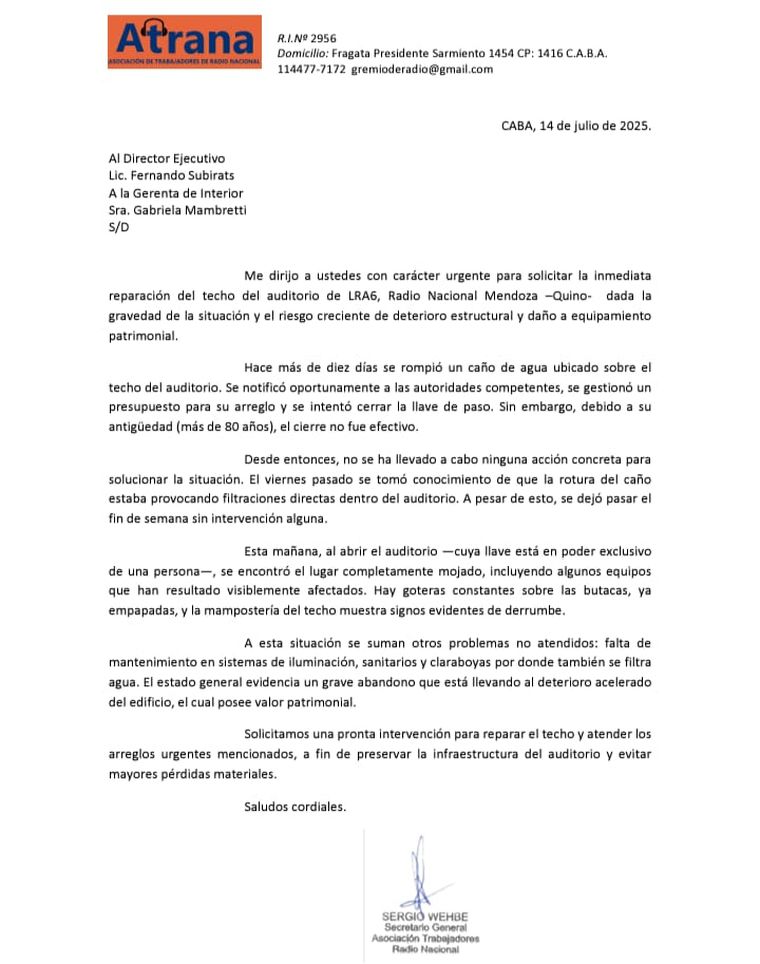 Una nota firmada por Sergio Wehbe, secretario general de la asociación de trabajadores de Radio Nacional, llegó a los directivos de Buenos Aires, específicamente al Director Ejecutivo Fernando Subirats y a la gerenta del interior Gabriela Mambretti, contando la situación del edificio de la radio que está a cargo de la mendocina Rosana Conte Ceschi.