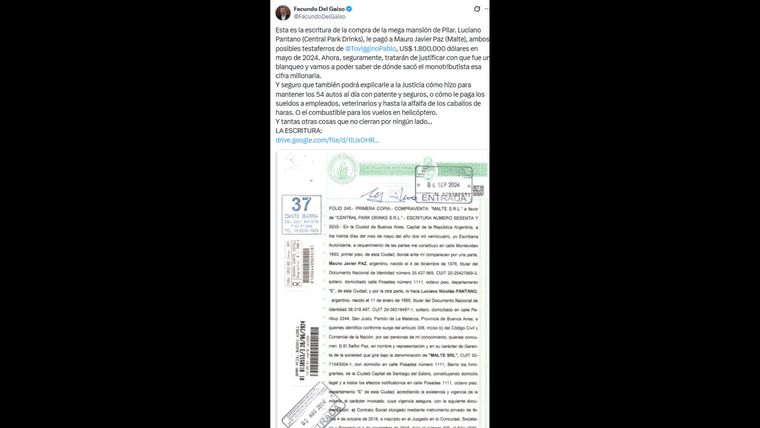 La escritura está a nombre de "Central Park Drinks SRL", perteneciente a Luciano Pantano, quien le pagó a Mauro Javier Paz (Malte), US$ 1.800.000 dólares en mayo de 2024. Ambos están sospechados de ser testaferros de Pablo Toviggino, el tesorero de la AFA.