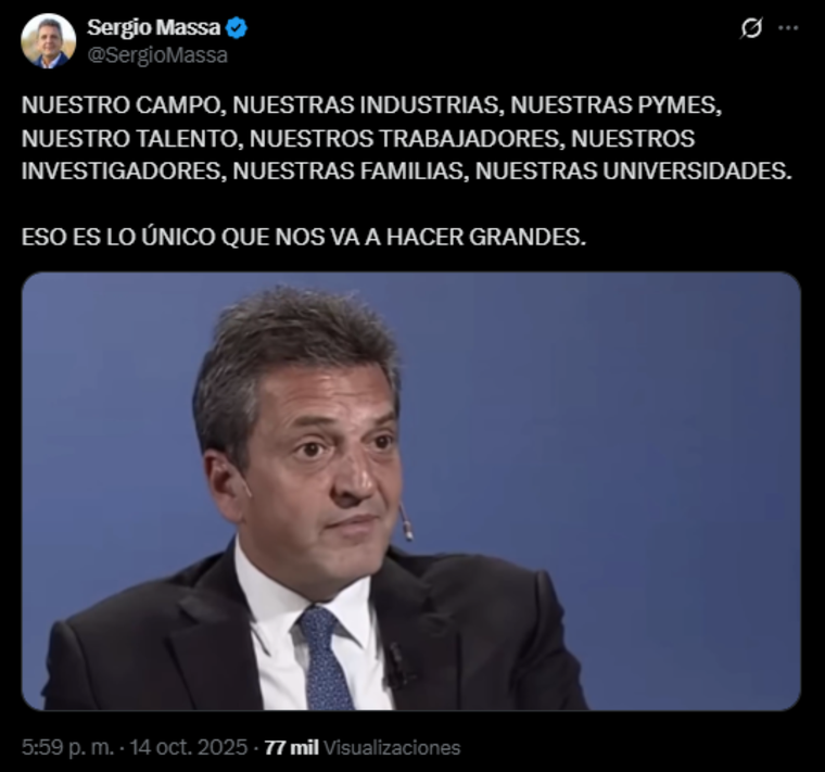 El exministro de Economía del Frente de Todos publicó un mensaje este martes en su perfil de X: "NUESTRO CAMPO, NUESTRAS INDUSTRIAS, NUESTRAS PYMES, NUESTRO TALENTO, NUESTROS TRABAJADORES, NUESTROS INVESTIGADORES, NUESTRAS FAMILIAS, NUESTRAS UNIVERSIDADES. ESO ES LO ÚNICO QUE NOS VA A HACER GRANDES".