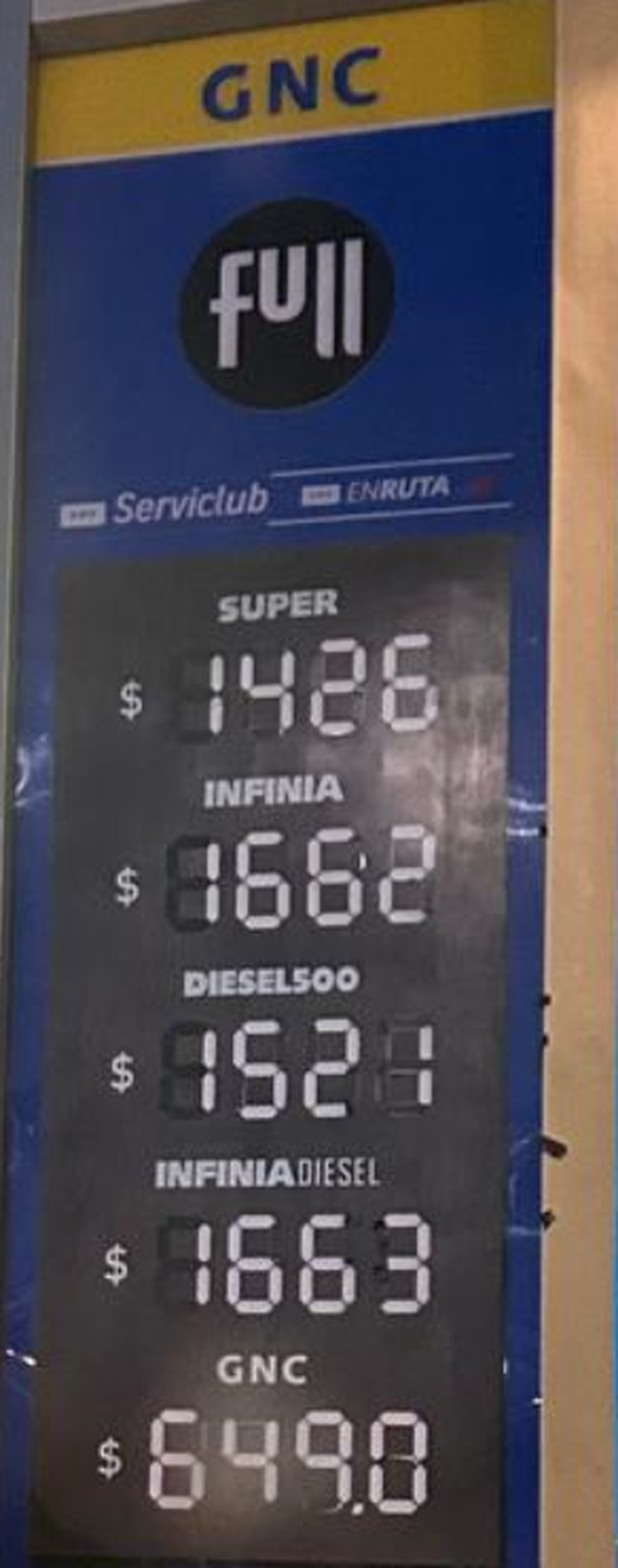 - Nafta Súper: pasó de $1367 a $1.426 el litro (+4,32%)