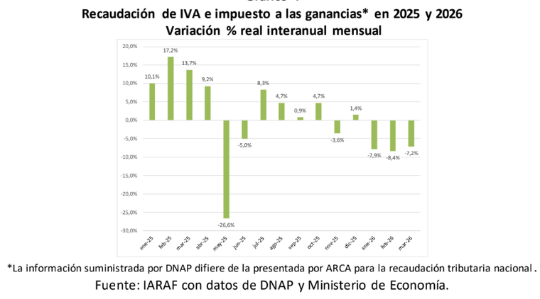 Según el Iaraf, la explicación de la caída de la coparticipación en marzo se debe "principalmente a la disminución real interanual del 12,7% de la recaudación del impuesto a las ganancias, mientras que el IVA también mostró una variación negativa, del 4%".