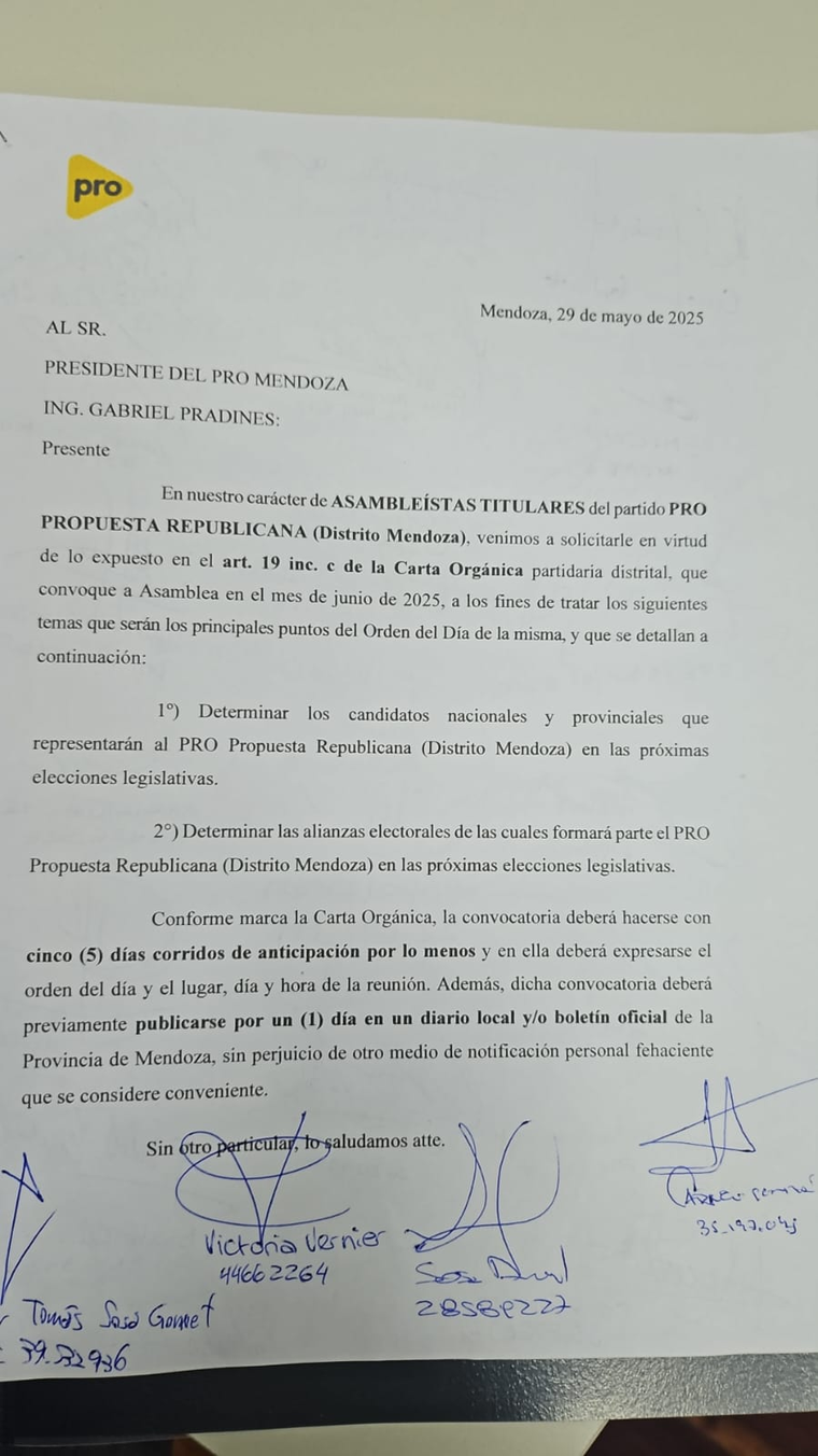 Por otro lado, este jueves por la tarde, el sector del PRO que está con Hebe Casado (que se fue del partido hacia La Libertad Avanza) solicitaron a la dirigencia del partido amarillo en Mendoza, liderado por Gabriel Pradines (dentro de La Unión Mendocina) que llamen a una Asamblea Provincial, en junio.