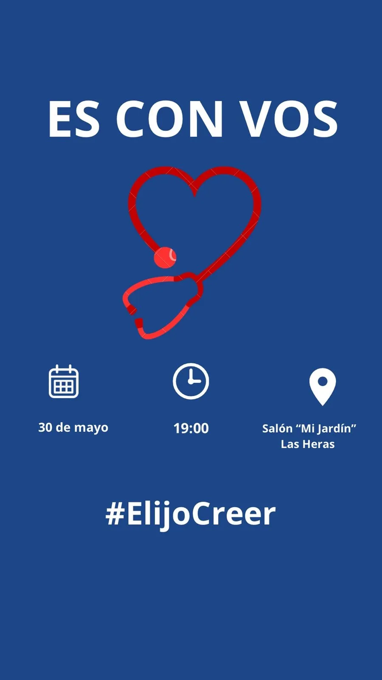 La invitación es simple, tiene fondo azul y tiene como título el lema "Es con vos", con letras blancas. En el centro acompaña un corazón color rojo, que también es un estetoscopio, haciendo referencia a la profesión de Orozco. Abajo, un hashtag "futbolero": #ElijoCreer.