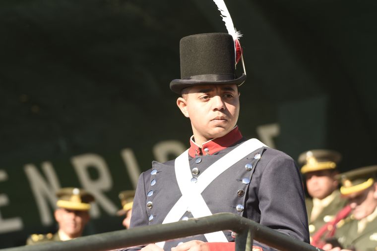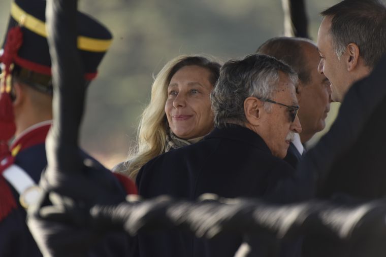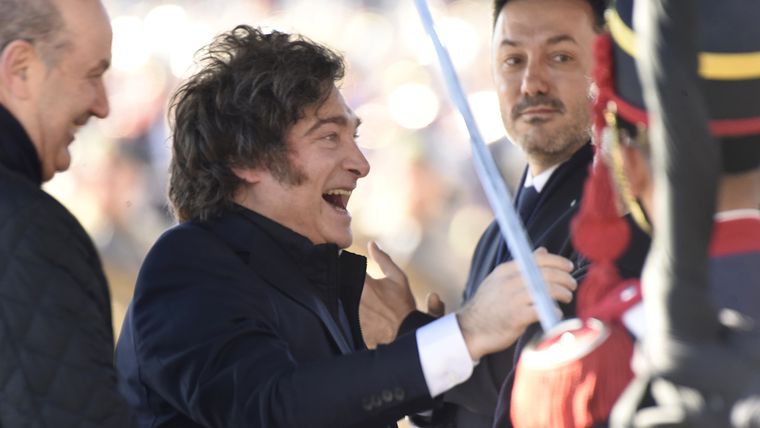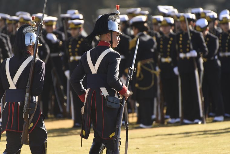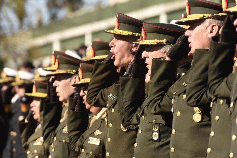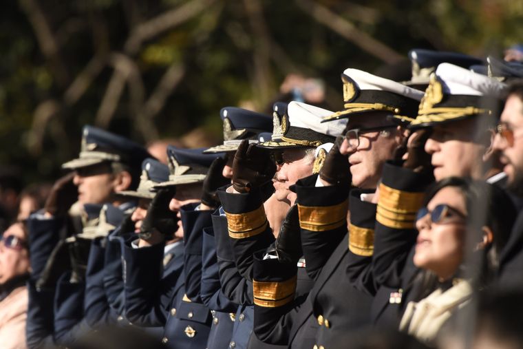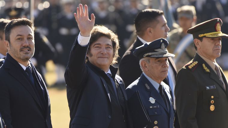 Milei estuvo escoltado por el ministro de Defensa, Luis Petri; el jefe del Estado Mayor Conjunto de las Fuerzas Armadas, Xavier Isaac; y los representantes de cada una de las fuerzas armadas: Carlos María Allievi (Armada), Carlos Presti (Ejército) y Marcelo Monetto (subjefe de Fuerza Aérea).