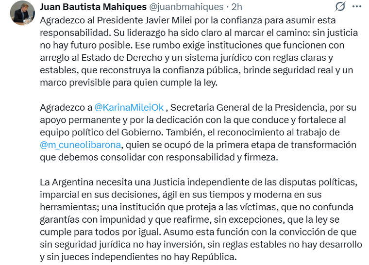 La señal llegó rápido: en su primer mensaje en redes sociales tras asumir, Mahiques eligió agradecerle directamente a Karina Milei. Un detalle que, en la Casa Rosada, nadie pasó por alto.