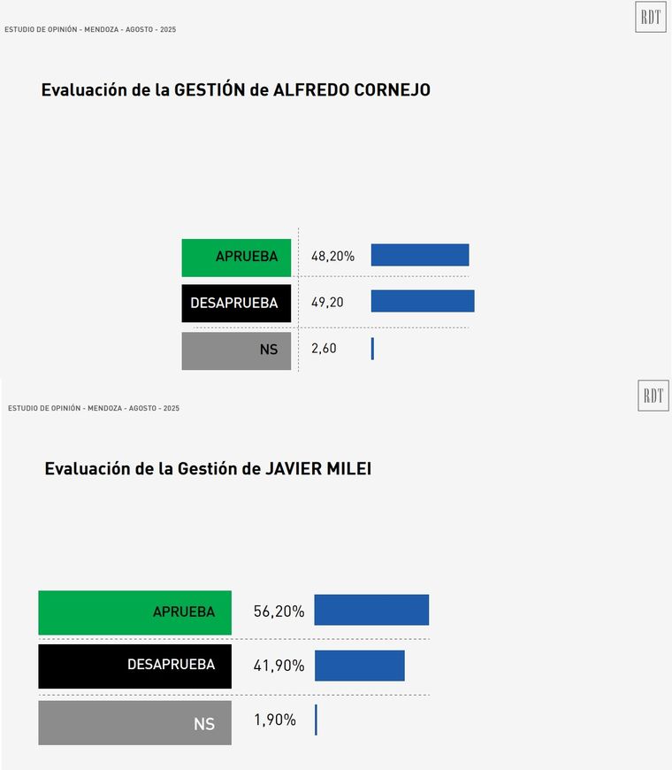 Otro de los puntos que relevó la encuesta fue la evaluación de los gestiones del presidente Javier Milei y el gobernador Alfredo Cornejo. En el caso del dirigente nacional hubo un conntundente respaldo, mientras que a nivel local se encendió una alarma para el mandatario provincial, ya que por primera vez hubo más encuestados que desaprobaron la gestión.