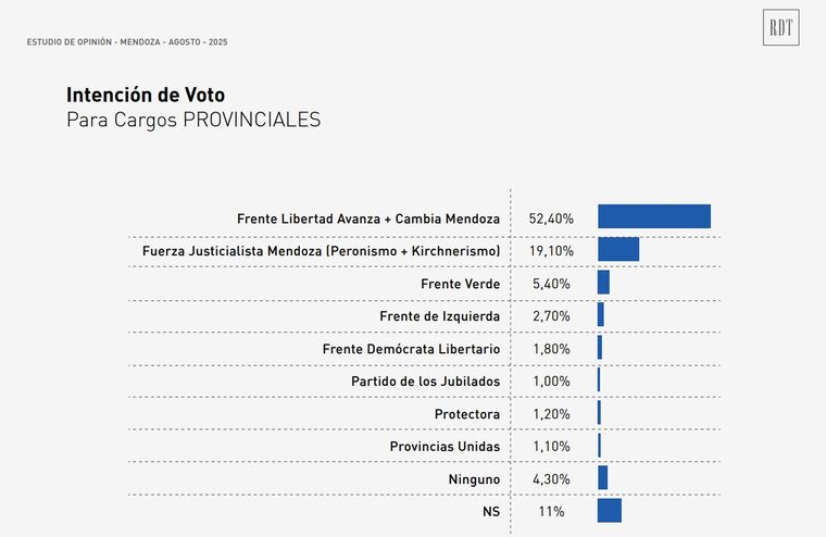 En cuanto a la intención de voto para cargos provinciales, el frente oficialista La Libertad Avanza+Cambia Mendoza logró el 52,4%, seguido por Fuerza Justicialista Mendoza con el 19,1% y por el Frente Verde con el 5,4%.