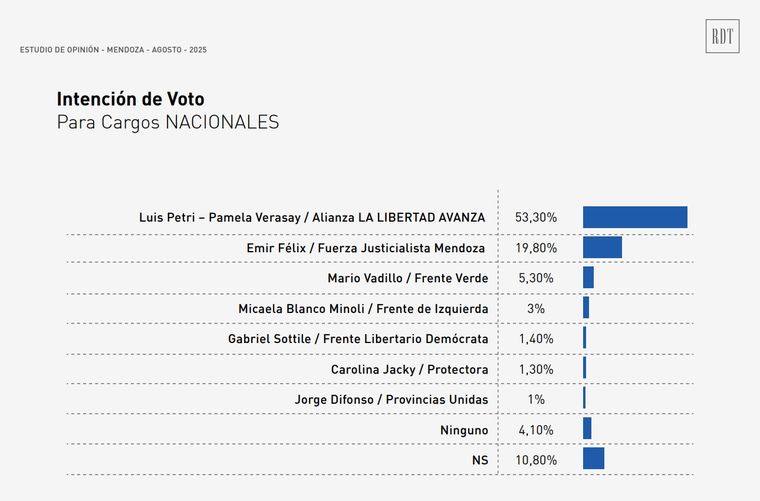 A dos meses de la elección, la encuesta arrojó una “ventaja robusta” del frente La Libertad Avanza+Cambia Mendoza de cara a estos comicios de medio término. El candidato oficialista Luis Petri cosechó el 53,3% de intención de voto en la categoría de diputados nacionales.
