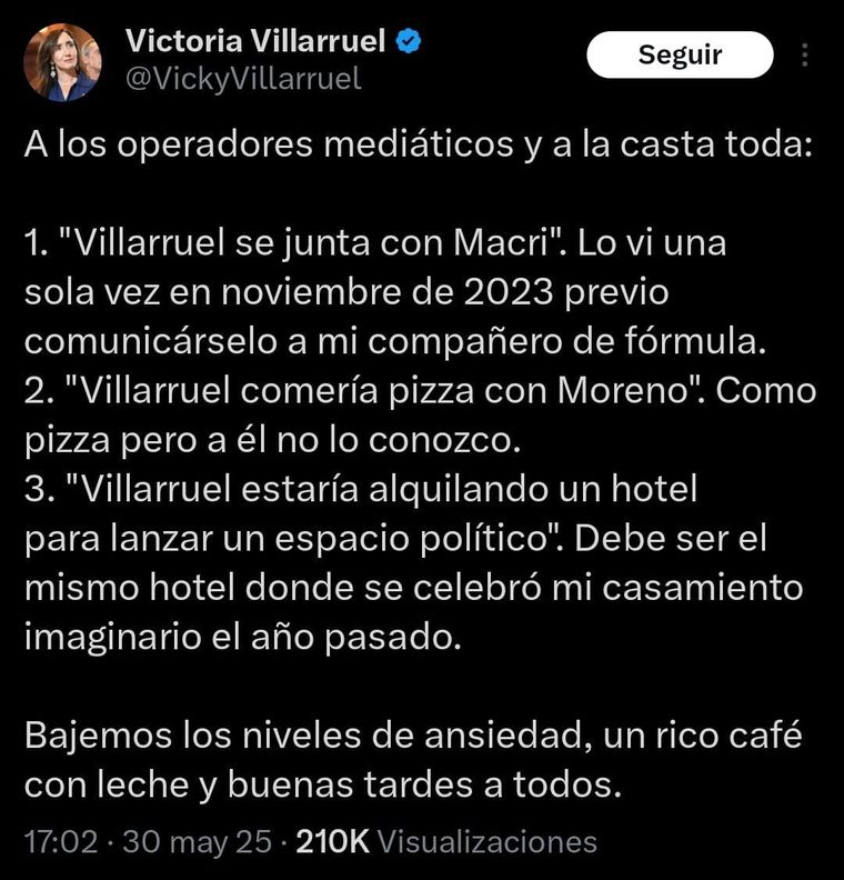 "A los operadores mediáticos y a la casta toda: 1. ‘Villarruel se junta con Macri’. Lo vi una sola vez en noviembre de 2023 previo comunicárselo a mi compañero de fórmula. 2. ‘Villarruel comería pizza con Moreno’. Como pizza pero a él no lo conozco", inició Villarruel en su cuenta de X, dejando en claro que no tiene acercamiento con la oposición.