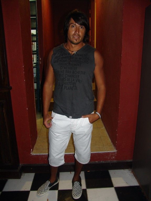 Ahora sí, uno que no descuidó ningún detalle en su atuendo fue Cristian Back (foto 3). El morocho lució su bronceado y vistió remera oscura, bermudas blancas y unas zapatillas con estampado a cuadros a tono con el piso del bar.