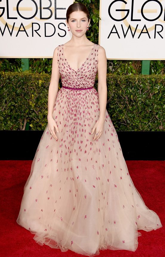 Anna Kendrick. Un look romántico de la mano de la diseñadora Monique Lhuillier color nude con detalles rojos. Aprobado.