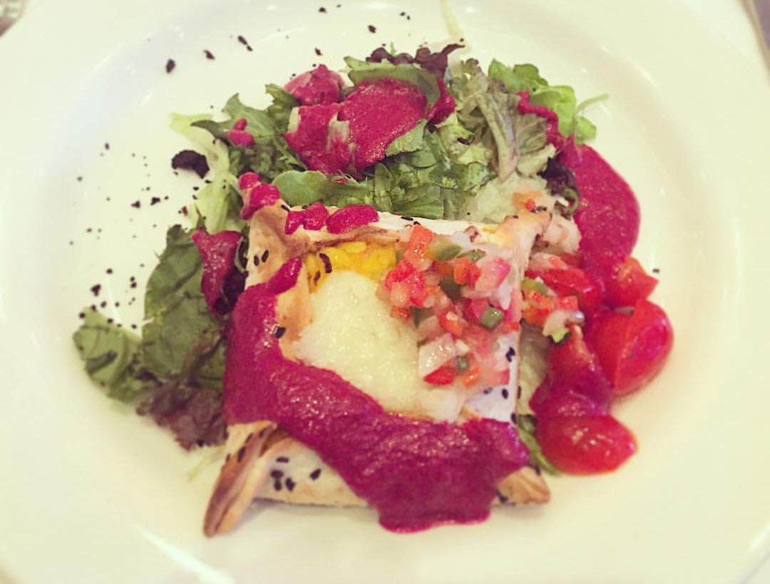 De entrada, se degustó un Pie tibio de maíz andino y queso de cabra, con micro mix y salsa criolla.