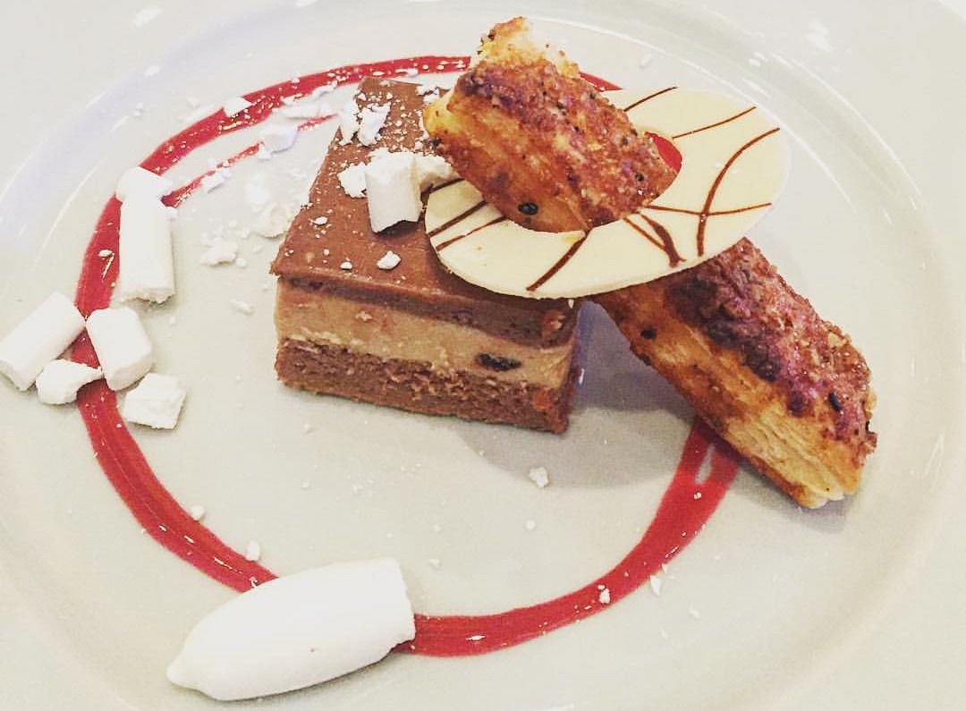 El broche de oro fue un cremoso Marroc con hojaldre de praliné y coulis de frutos rojos.
