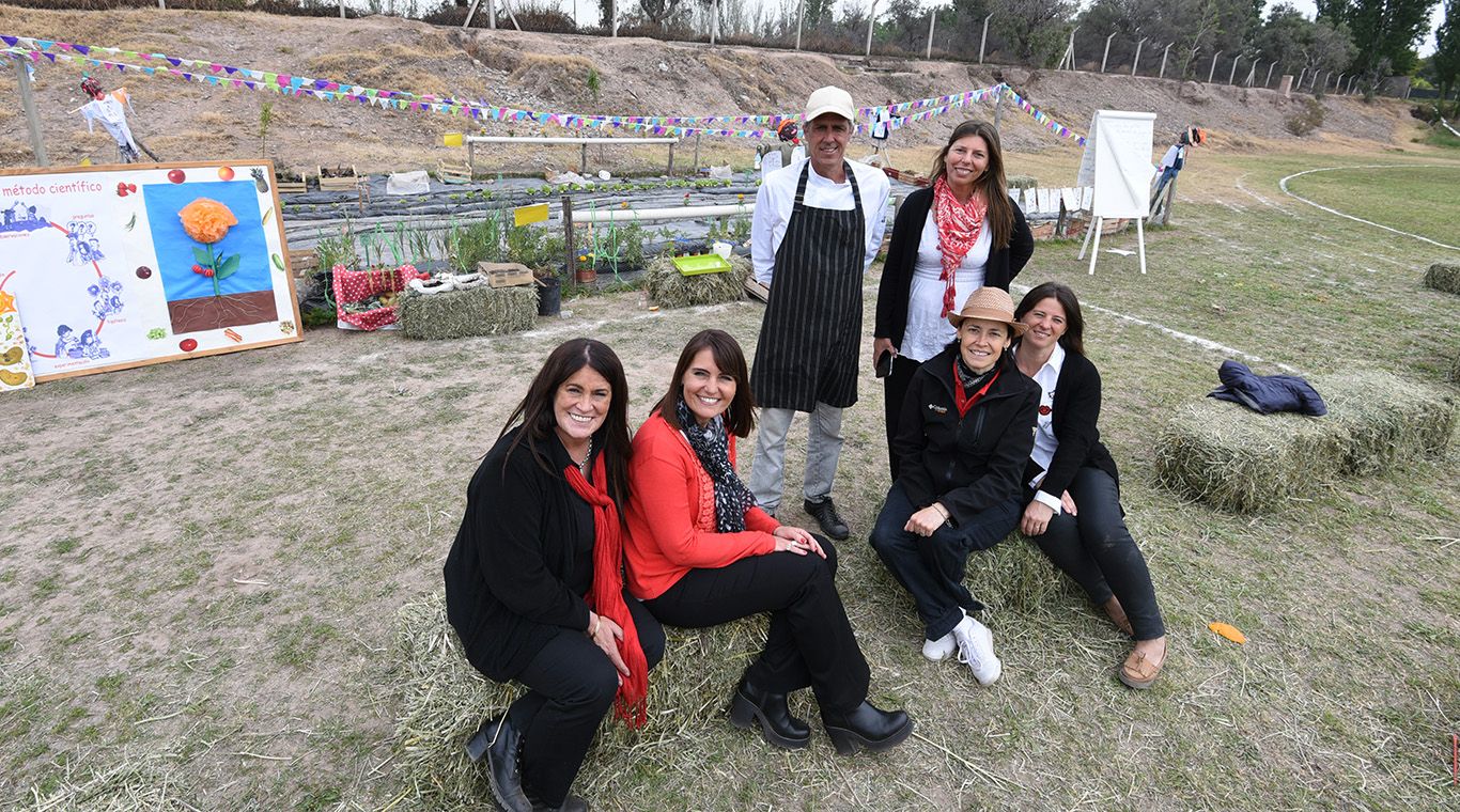 El chef Max Casá junto a profesoras en la huerta del Colegio.