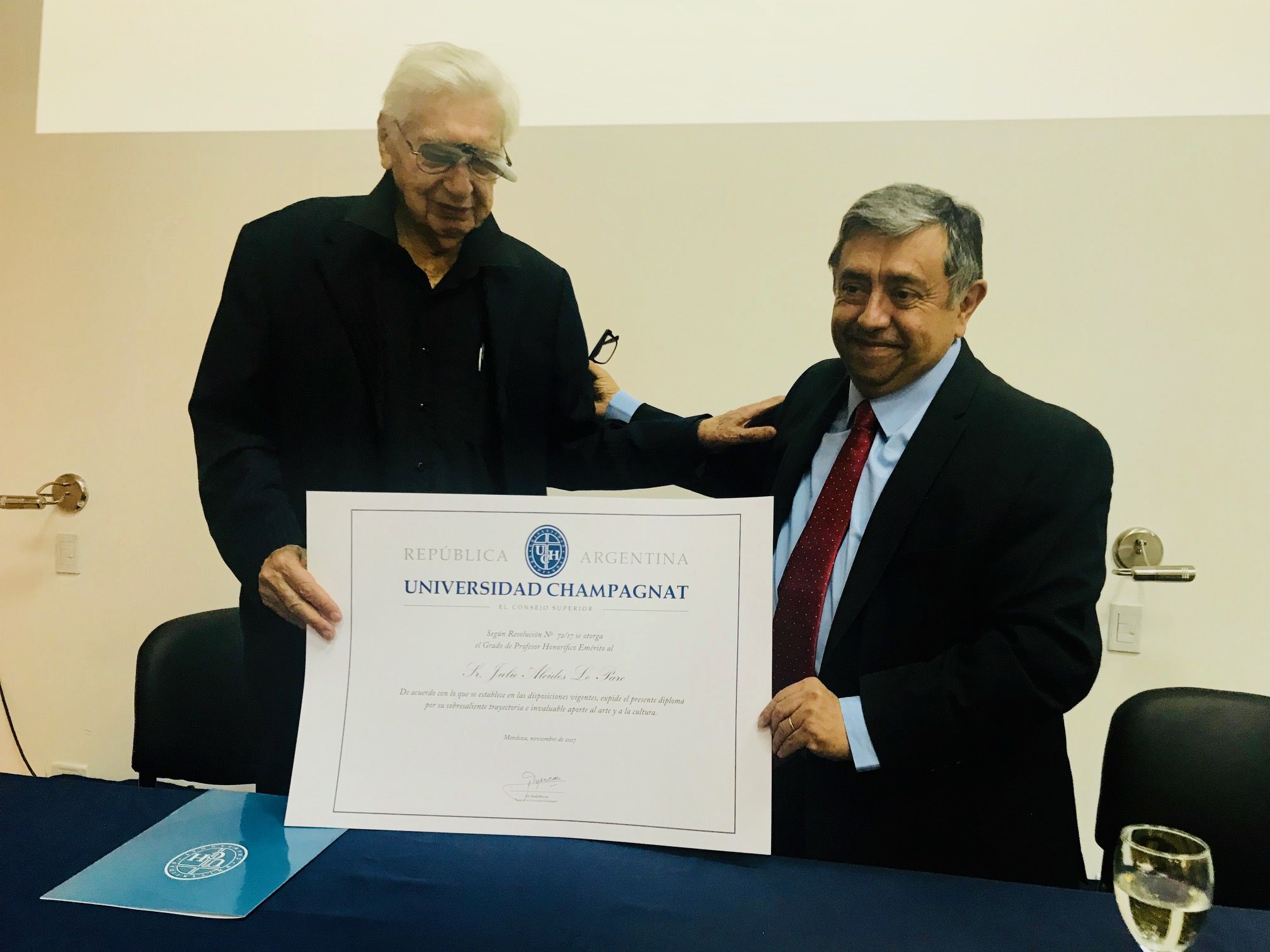 El lunes 27 de noviembre, el destacado artista mendocino Julio Le Parc recibió de manos del rector de la Universidad Champagnat; Raúl Mercau, el Doctor Honoris Causa por su invaluable trayectoria y aporte al arte y a la cultura.