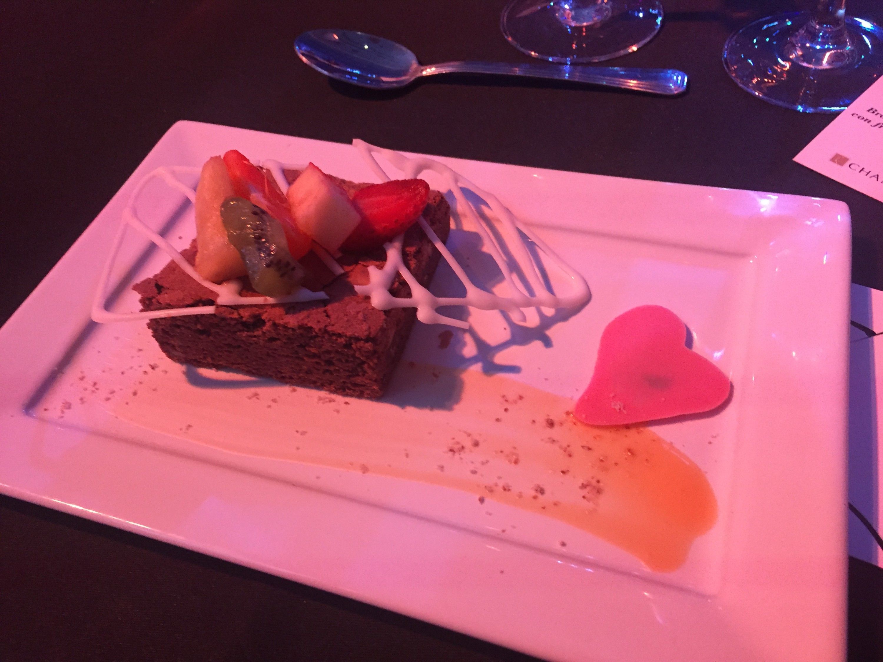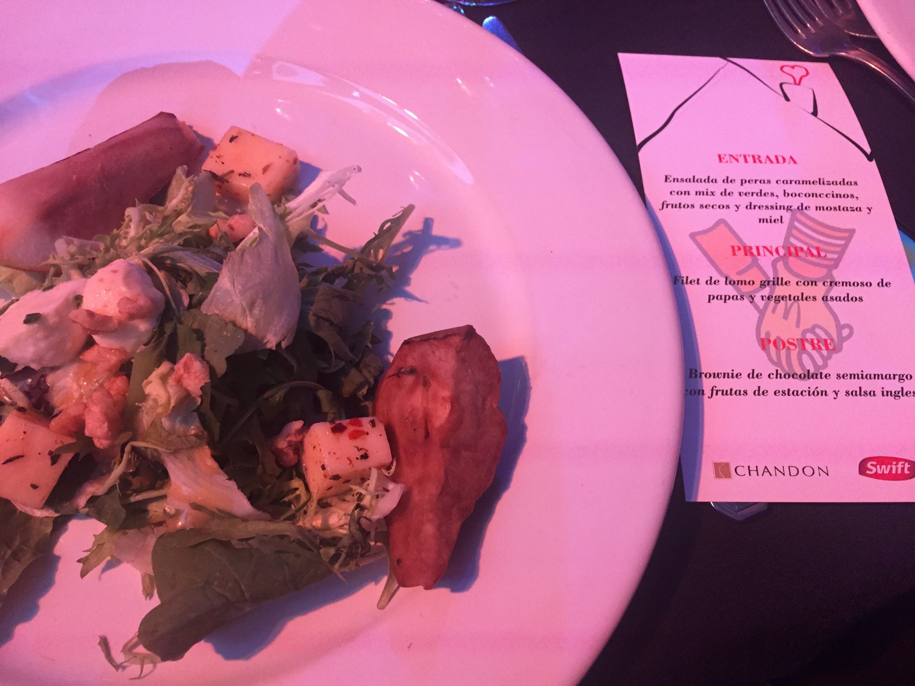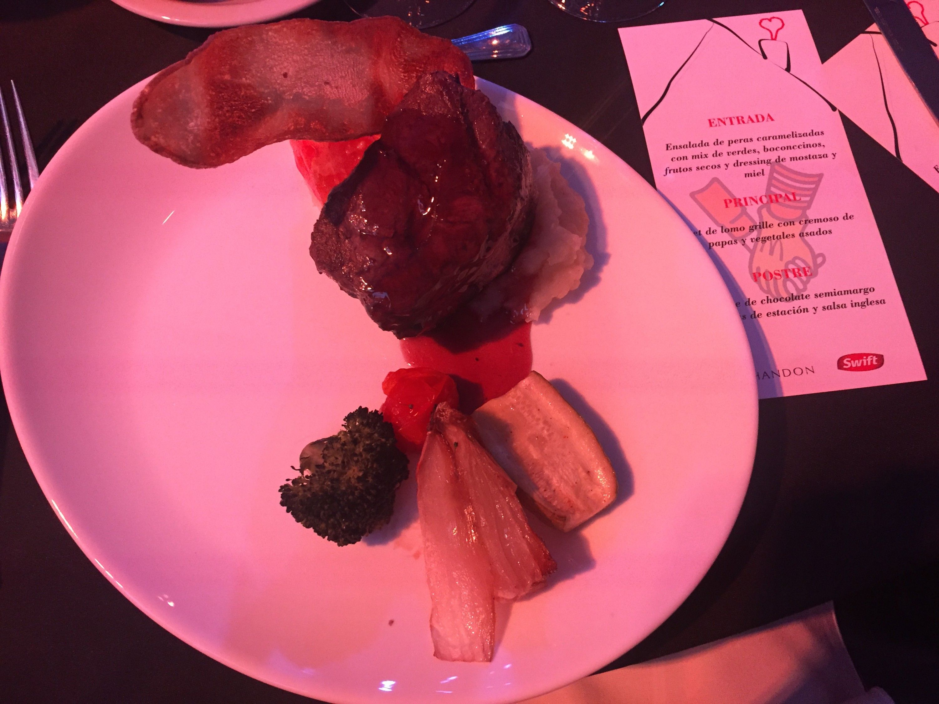 Los presentes fueron recibidos con un bandejeo de finger food de trucha y jamón crudo, así como también con una opción criolla: empanadas de carne. Entrada: ensalada de peras caramelizadas con mix de verdes, boconccinos, frutos secos y dressing de mostaza y miel. Plato principal: filet de lomo grillé con cremoso de papas y vegetales asados. Postre: brownie de chocolate semiamargo con frutas de estación y salsa inglesa.