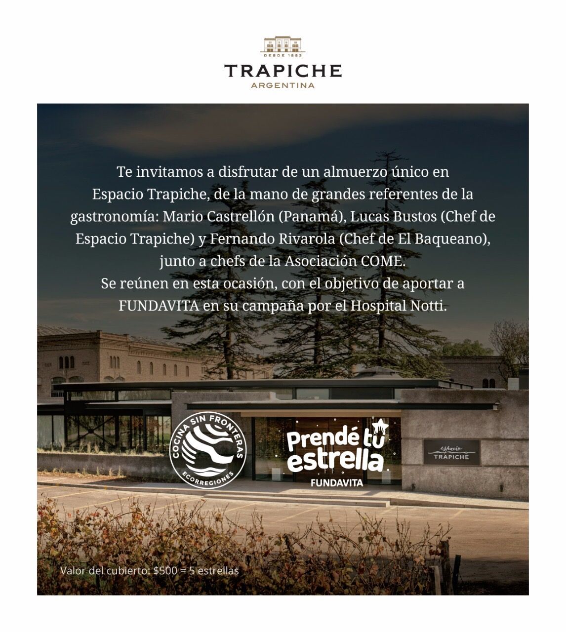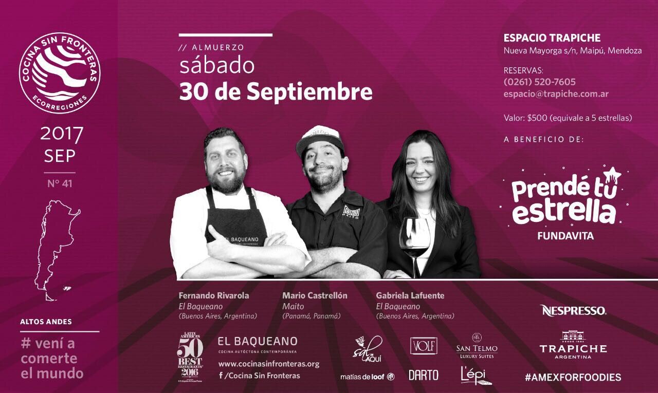 Junto a Lucas Bustos, Responsable de Espacio Trapiche, cocinarán varios chefs mendocinos del team de COME; y además serán de la partida el propio Rivarola -El Baqueano-, Mario Castrellón -Maito- y la sommelier Gabriela Lafuente.