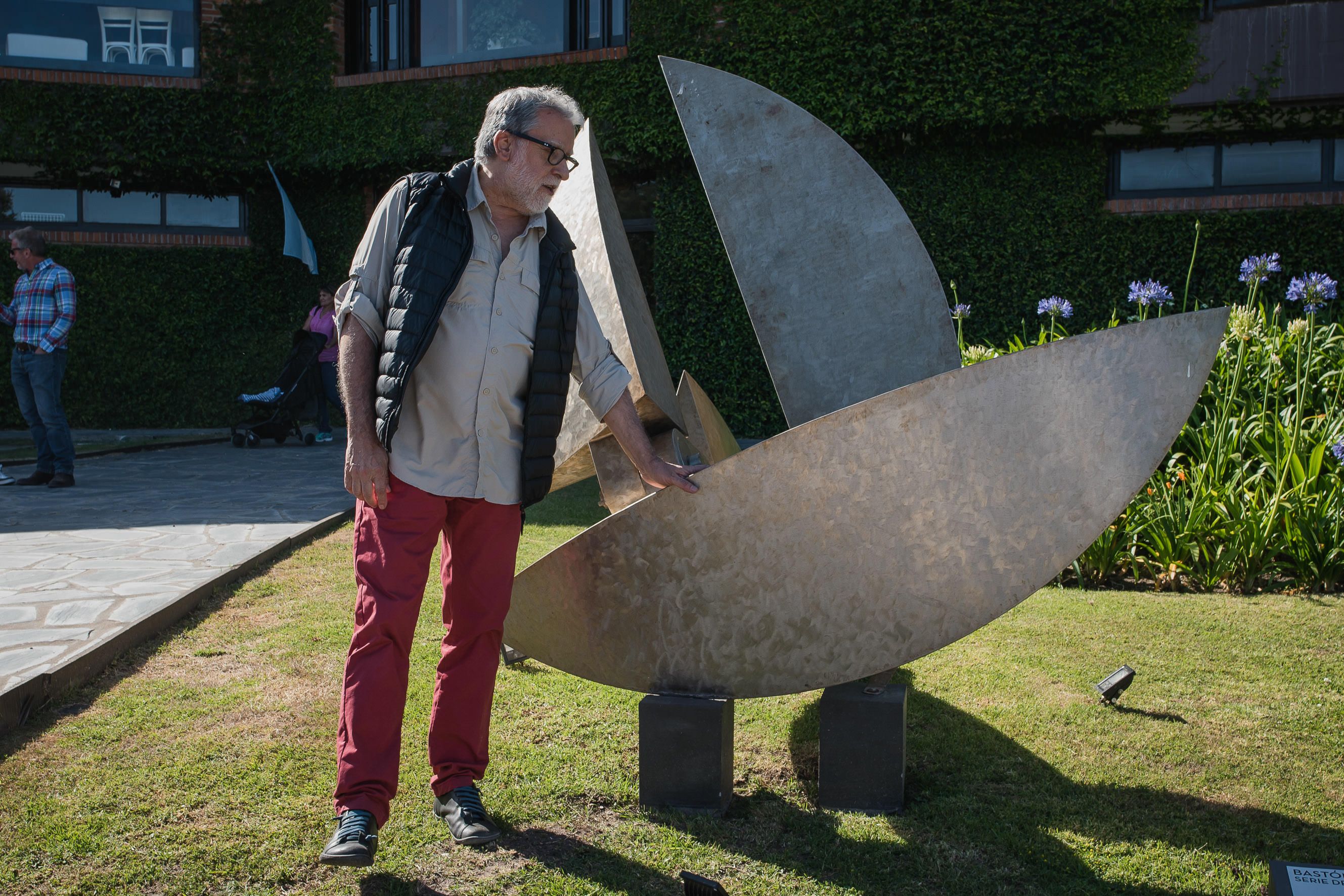 Rueda nos expresa que la presente exposición contiene esculturas de Hernán Dompé (Buenos Aires, 1946) hechas en cemento, metal y madera, las que remiten a mitologías ancestrales como son las barcas, totems y comadres, tan representativas del autor y amadas por el público. Esculturas de grandes dimensiones del consagrado Alberto Bastón Díaz (Buenos Aires, 1946) elaboradas en hierro, describiendo figuras antropomorfas, las que expresan claramente el discurso del artista, identificándolo y representándolo. Pinturas de Osvaldo Monzo (Buenos Aires, 1959) que sugieren un bello diálogo con inteligencia, tomando herramientas básicas expresadas en el color, forma, textura y composición. También es fuerte la presencia en este encuentro contemporáneo, las pinturas y dibujos cargados de texturas visuales que nos comparte Juan Lecuona (Buenos Aires, 1956) y las sutiles obras entre abstracción y aproximación al paisaje de la Cordillera de Los Andes, como son los trabajos de Carlos Gómez Centurión (San Juan, 1951) y que él como pocos logra alcanzar.