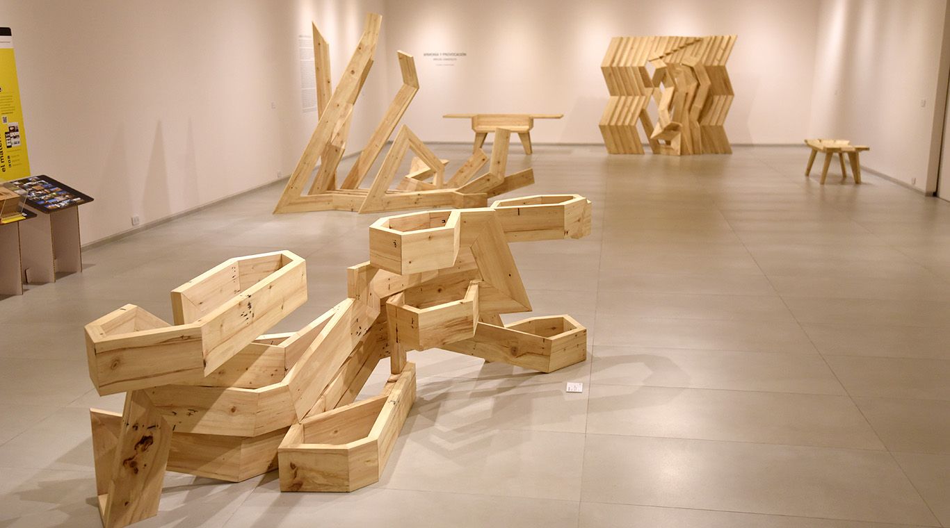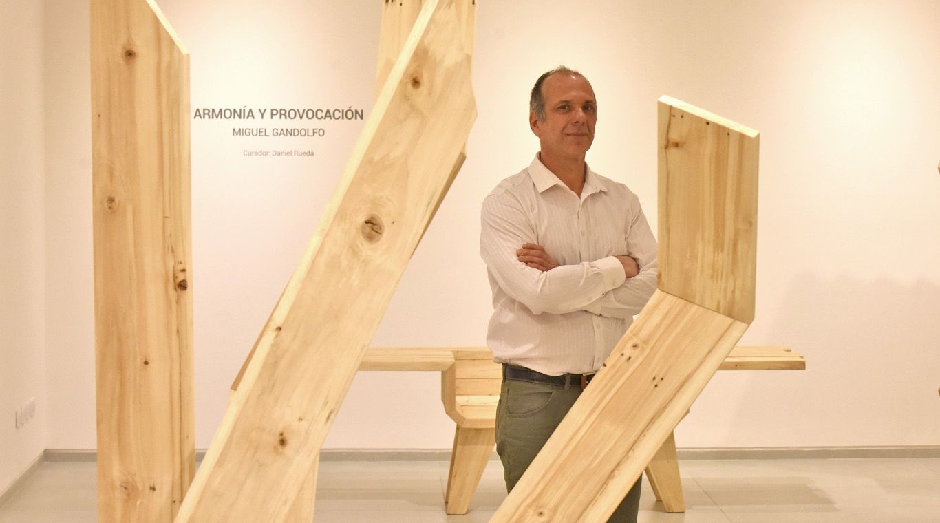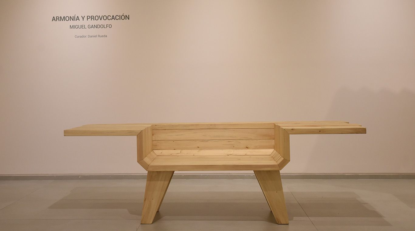 En la Sala 2 Miguel Gandolfo, uno de los referentes contemporáneos más importantes de nuestra provincia por el gran desarrollo que ha tenido su obra. Con curaduría de Daniel Rueda presentó ¨Armonía y provocación¨, destaca el claro gusto del artista por la definición precisa ante las singularidades de la madera, con propuestas visuales diferenciadoras. También en el relato dice presente su otro oficio, el de carpintero, que le ha permitido rozar con el diseño y crear objetos de funcionalidad real y algunas veces aparente.